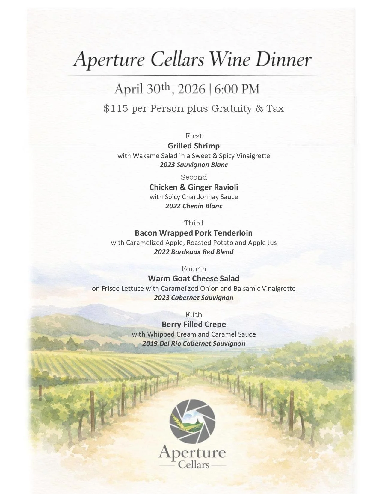 Aperture Cellars Wine Dinner - Thursday April 30th at 6pm