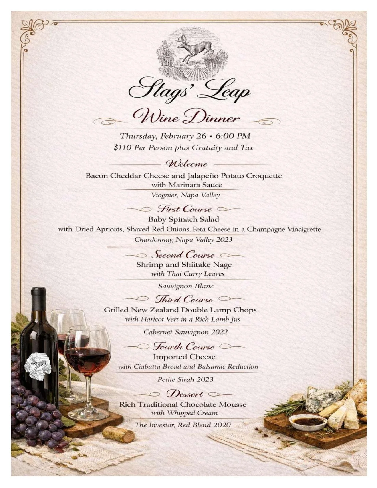 Wine Dinner. This special event brings the legacy and craftsmanship of one of Napa’s most iconic wineries straight to your table, with each course thoughtfully paired to showcase the beauty and balance of Stags' Leap Winery wines.